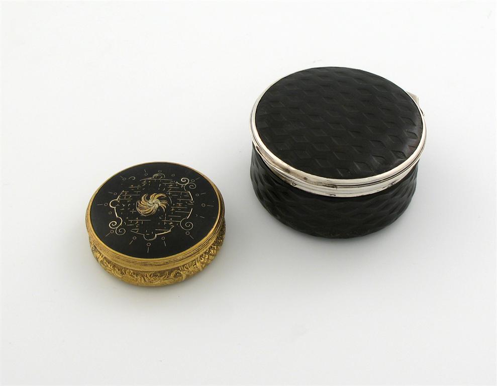 circular form, textured decoration, the hinged cover with a reeded border, inscribed and dated '1840', plus a George III old Sheffield plated snuff box of circular form, foliate mounts, inlaid decoration. (2)