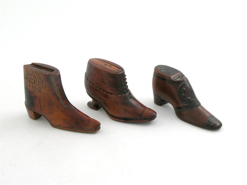 A Victorian carved wooden shoe snuff box, the hinged cover with inlaid decoration, dated 1866, plus two further shoe snuff boxes. (3)