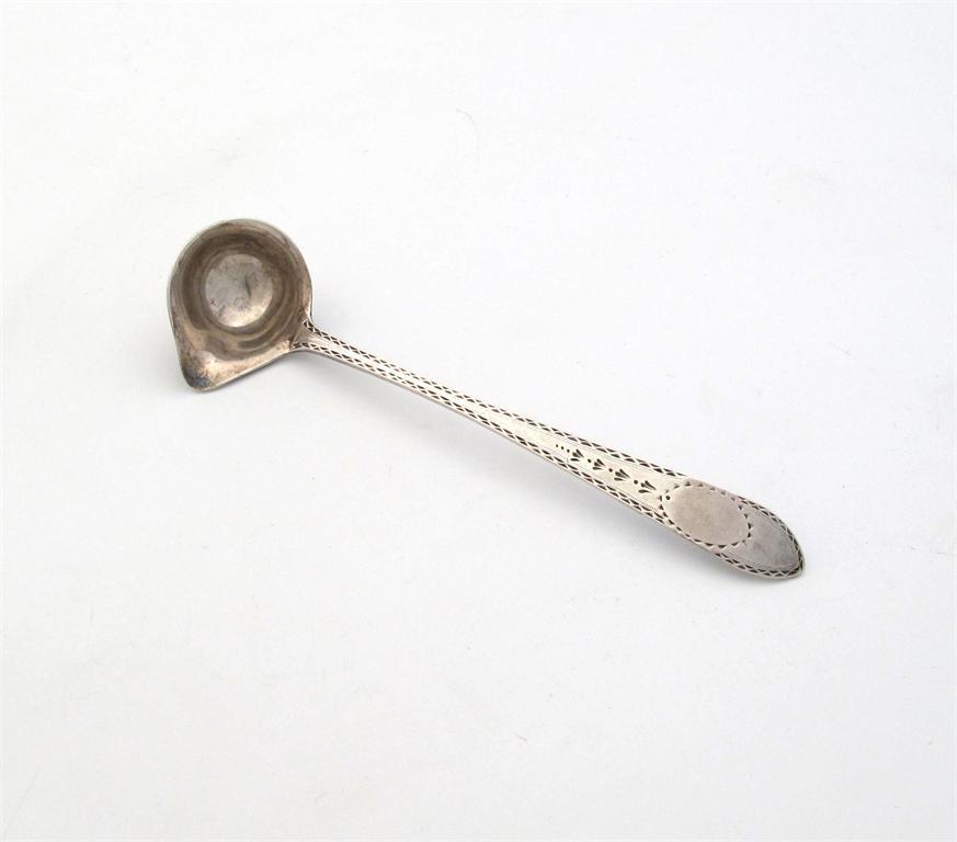 An early 19th century silver Irish cream ladle, by James Salter, Cork, c.1820, pointed end, with bright cut decoration, vacant cartouche, length 13.2cm, approx. weight 0.5oz.
