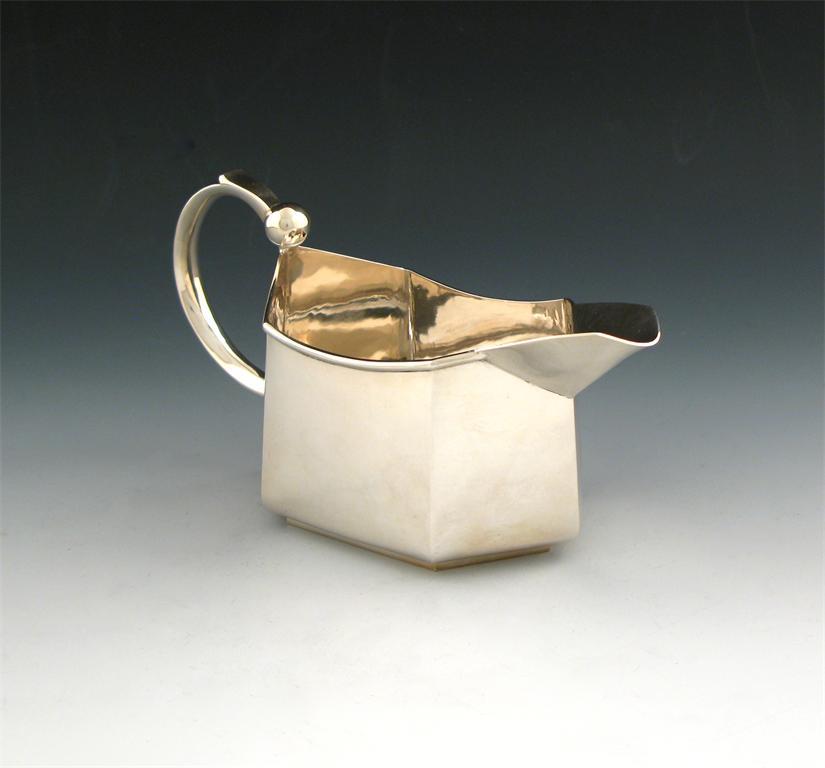 By Roger Squires, a modern silver sauce boat, London 1999, oval panelled form, the scroll handle with a ball junction, length 19cm, approx. weight 9oz.