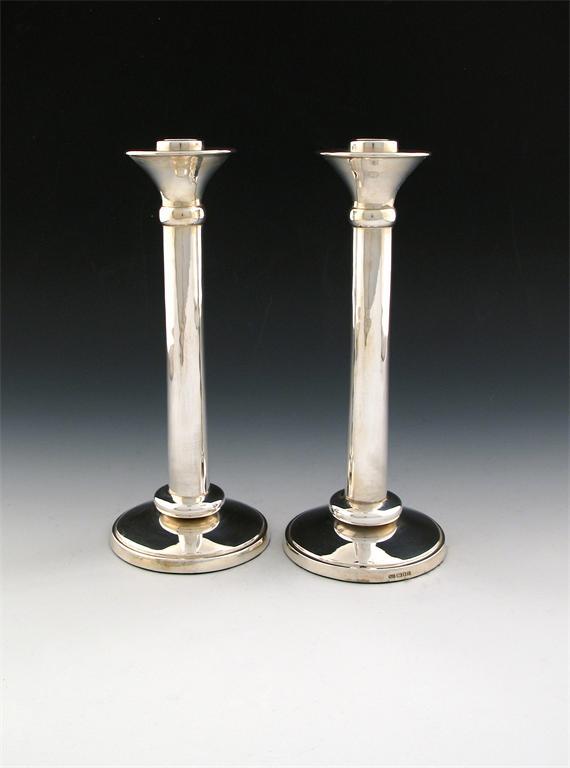 By Roger Squires, a pair of modern silver candlesticks, London 1996, the slender columns, spread circular capitals, on raised circular bases, filled, height 23.5cm. (2)