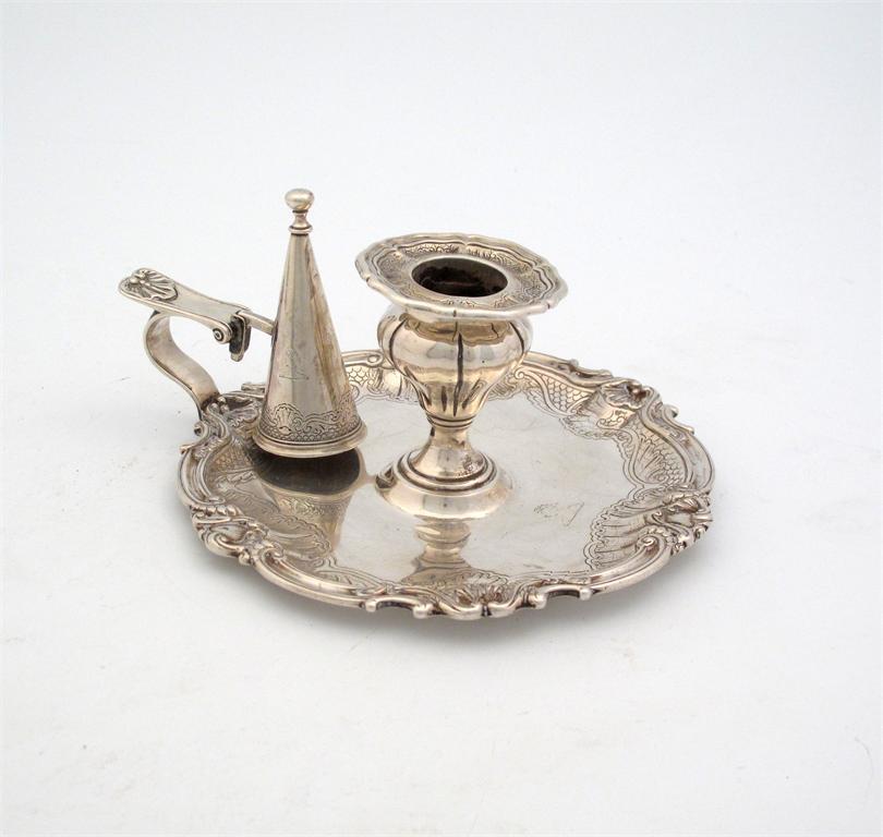 A Victorian silver chamber stick, by George Ivory, London 1848, shaped circular form, foliate scroll border, conical snuffer, scroll handle, diameter 15cm, approx. weight 10oz.