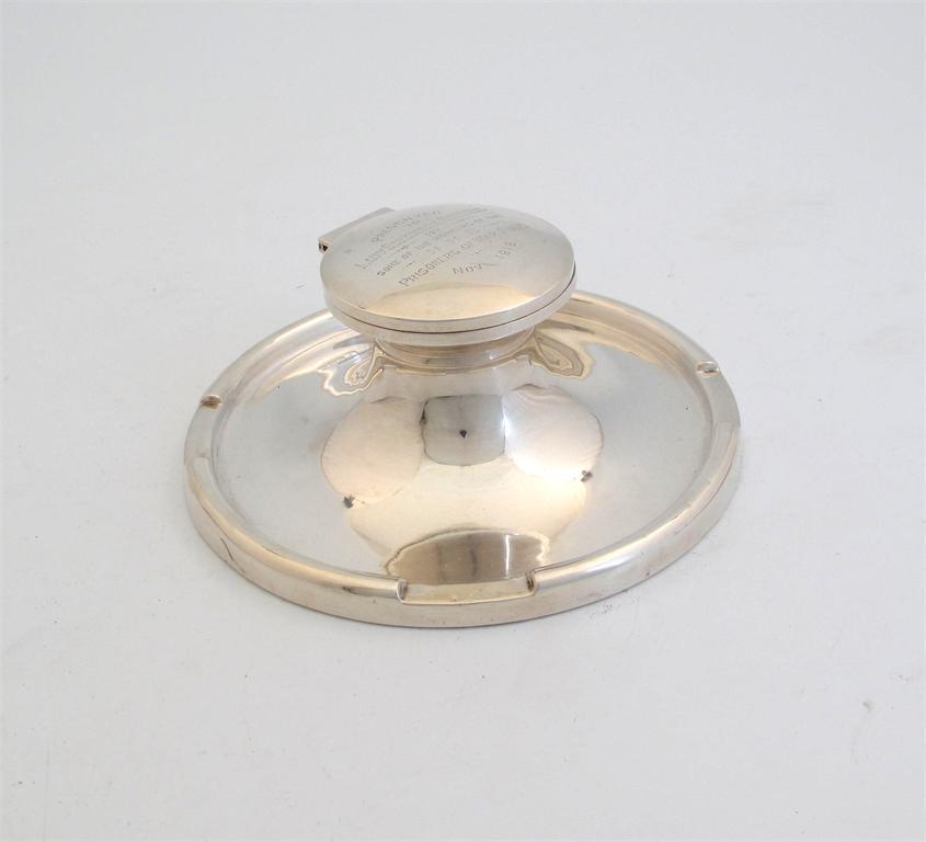 circular form, the hinged cover inscribed,' Presented to Lady Gwendolen Guiness by some of the workers of the R.N.D Prisoners of War Fund November 1918', diameter 17.5cm.