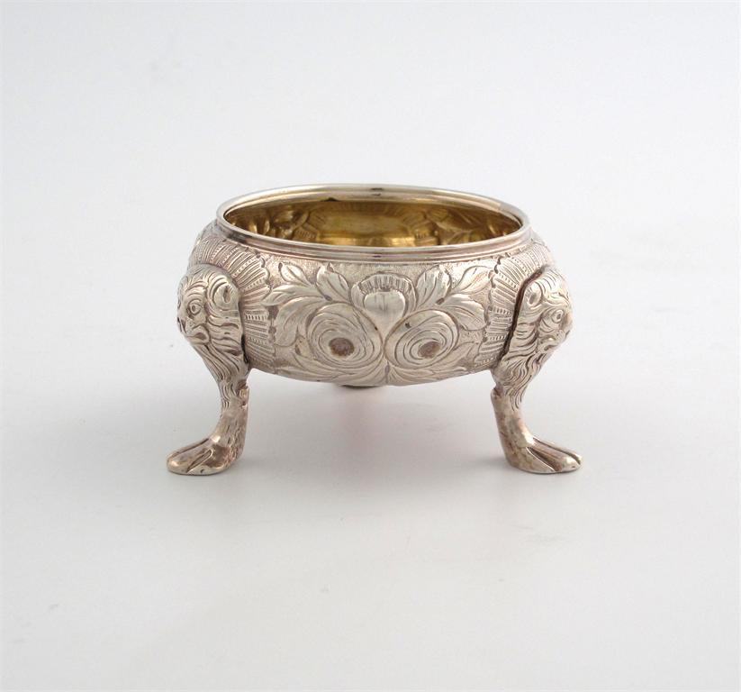 A mid 18th century Irish silver salt cellar, maker's mark partially worn, R?, Dublin circa 1760, circular form, embossed decoration, on three lion mask paw feet, gilded bowl, diameter 7.5cm, approx. weight 3oz.