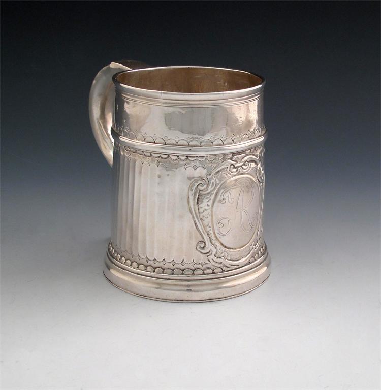 A Queen Anne silver mug, possibly by John Jackson, London 1703, tapering circular form, scroll handle, part fluted decoration, scroll mounted cartouche, initialled, height 11cm, approx. weight 9oz.