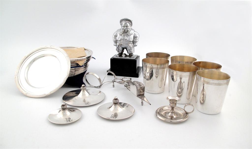 comprising: sixteen side plates of circular form, ribbon and reed borders, four beakers of tapering circular form, three jam pot covers, a pair of scissor candle trimmers, a miniature chamber stick, a tea glass holder, and a chrome mascot modelled as a yokel, on an ebonised plinth. (qty)