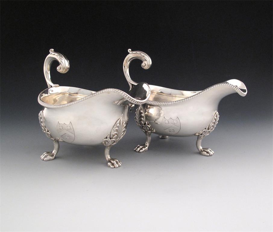 oval form, gadroon border, leaf capped flying scroll handle, on three foliate capped lion paw feet, engraved with an armorial, length 19.7cm, height 14.7cm, approx. weight 30oz. (2)