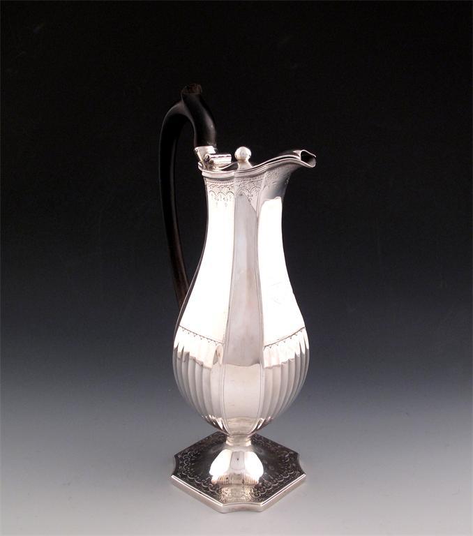 shaped rectangular baluster form, part fluted decoration, scroll handle, hinged cover with a ball finial, on a raised shaped square foot with bright-cut decoration, engraved with an armorial, height 32cm, approx. weight 24oz.