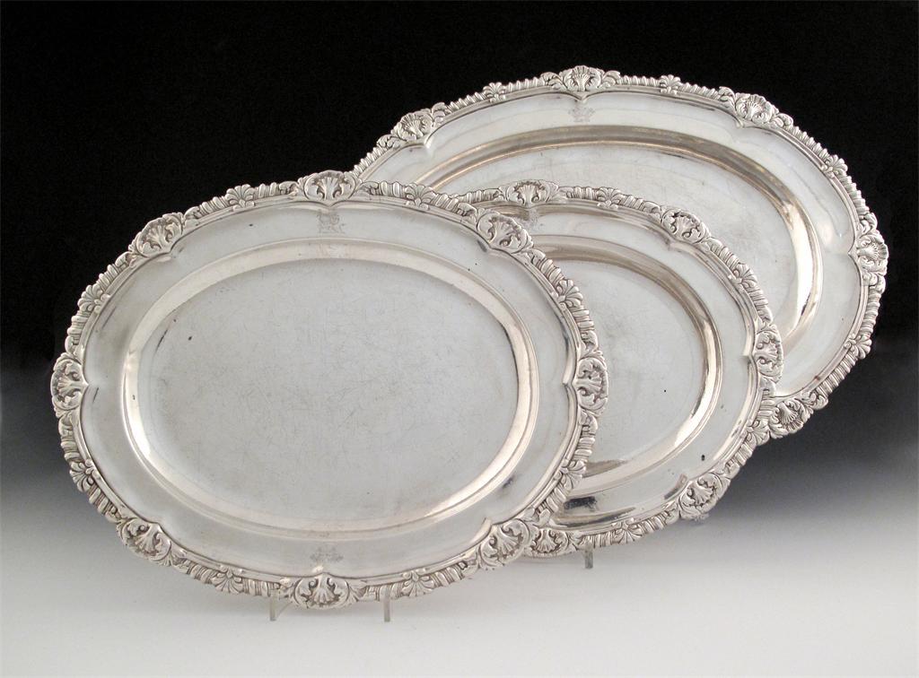 oval form, shell and gadroon borders, engraved with two crests, the larger platter with scratch weight '76oz 8dwt', one of the smaller ones with scratch weight '40oz 2dwt', length of larger 46.8cm, , length of smaller 33.3cm, approx. total weight 148oz. (3)