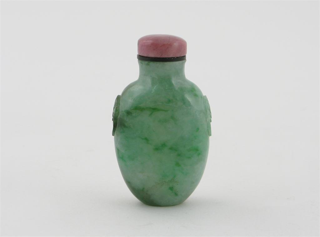 A Chinese jadeite snuff bottle, 19th century. The ovoid body carved with mask and ring handles to the sides, 6cm. Provenance: an English private collection.