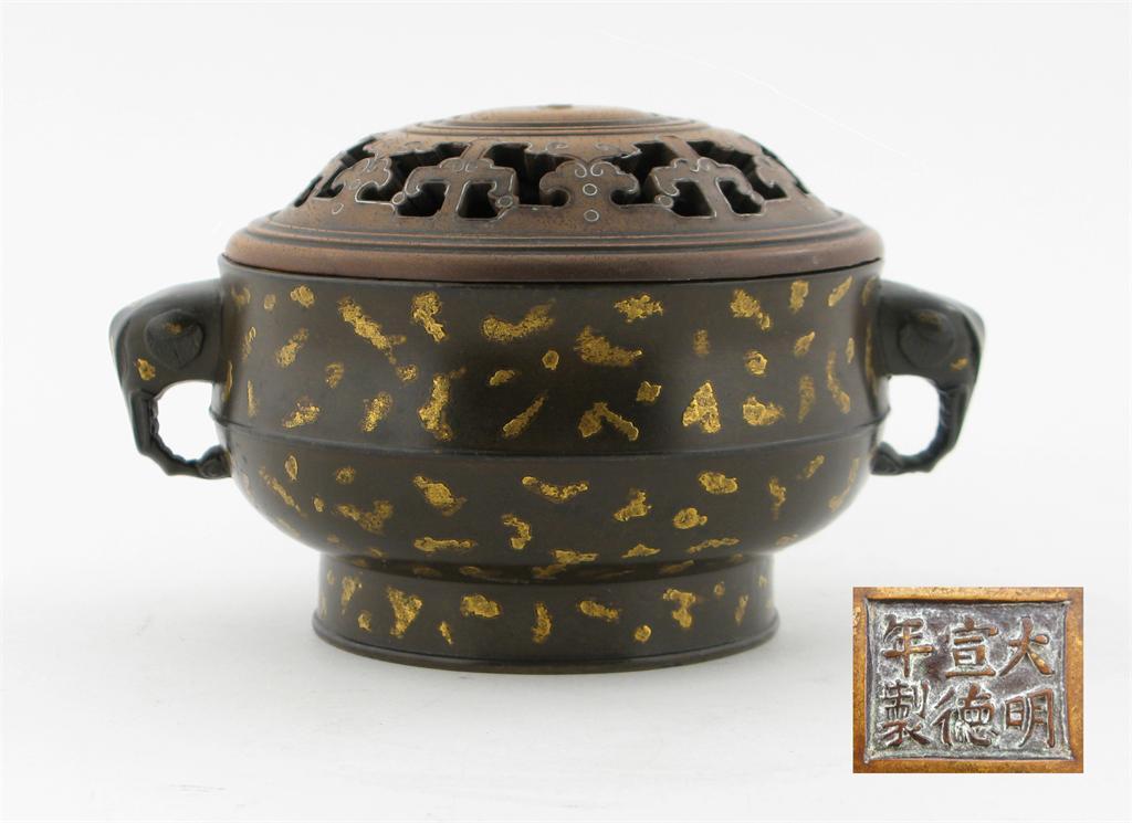 A Chinese bronze gold splash incense burner, six character Xuande mark but 18th century. With elephant head handles, the wood cover inlaid with silver wire, the cover cracked and with a knop lacking, 15cm. (2)