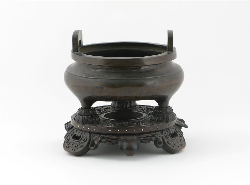 A large Chinese bronze incense burner, 19th century. With loop handles to the rim, the body inlaid in silver with stylized flowers and foliage and raised on three feet, together with an elaborately carved hardwood stand, 30cm. (2)