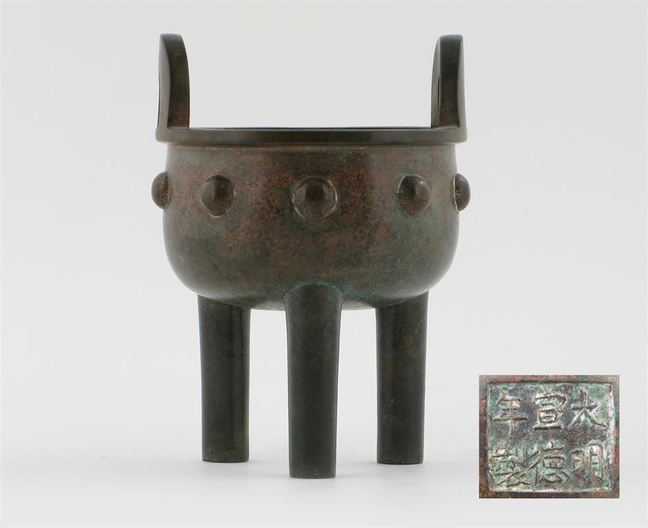 A Chinese bronze tripod censer, six character Xuande mark but probably 18th century. Raised on tall legs, with high loop handles and nine studs moulded to the body, 16cm.