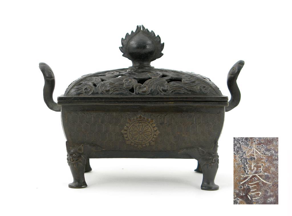 A Chinese bronze rectangular incense burner and cover, 16th/17th century. With ruyi-shaped handles, the knop as a flaming pearl, the body cast with a single stylized flowerhead on a diaper ground, the pierced cover cast as ruyi clouds, two character mark Ben-Yu (beginning of glory), 20.2cm wide. (2)