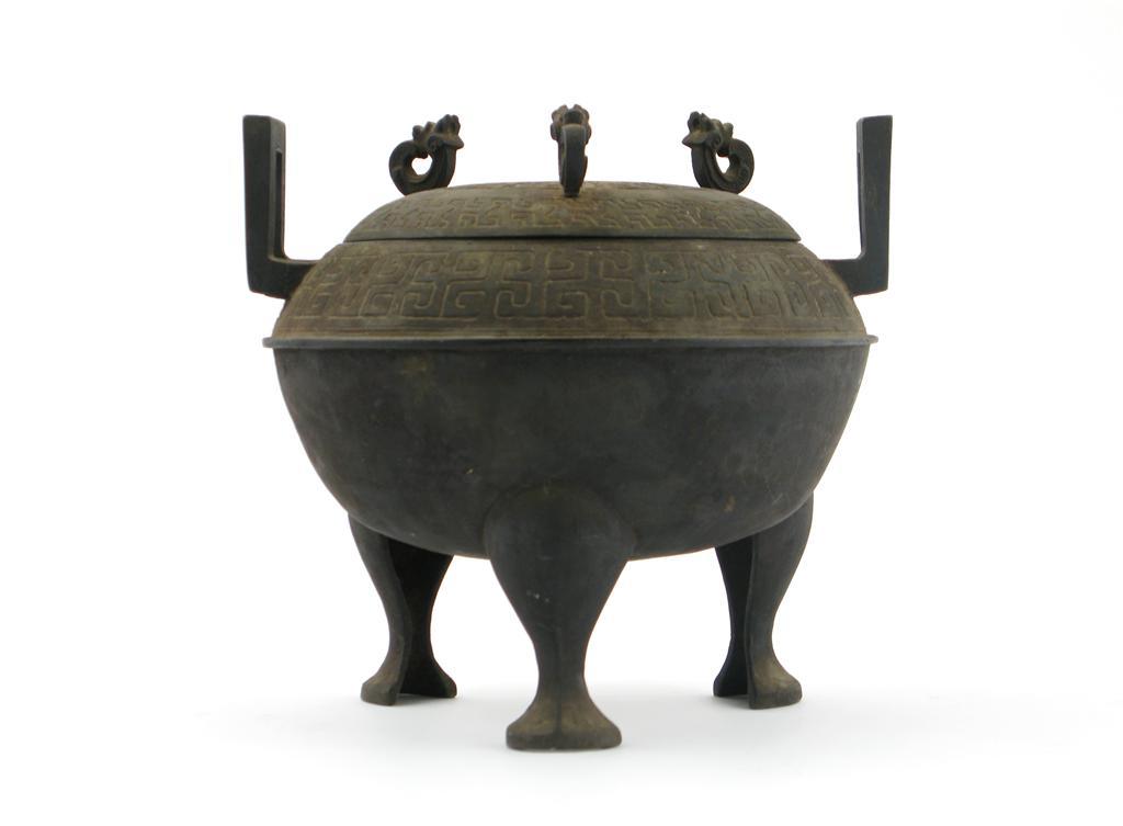 A Chinese bronze and silver inlaid ding and cover, probably late Ming. The compressed circular body with angled handles, the lid with three animal ring lifts which become feet, the shoulder cast with a stylized geometric band, the interior of the vessel and the underside to the cover cast with characters, all on three tall feet, 27cm across. (2)