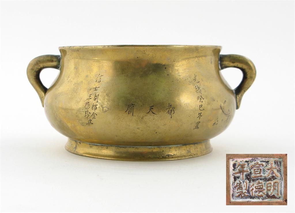A Chinese bronze inscribed incense burner, six character Xuande mark but probably later. One side inscribed with lines of calligraphy and single characters, 17cm.