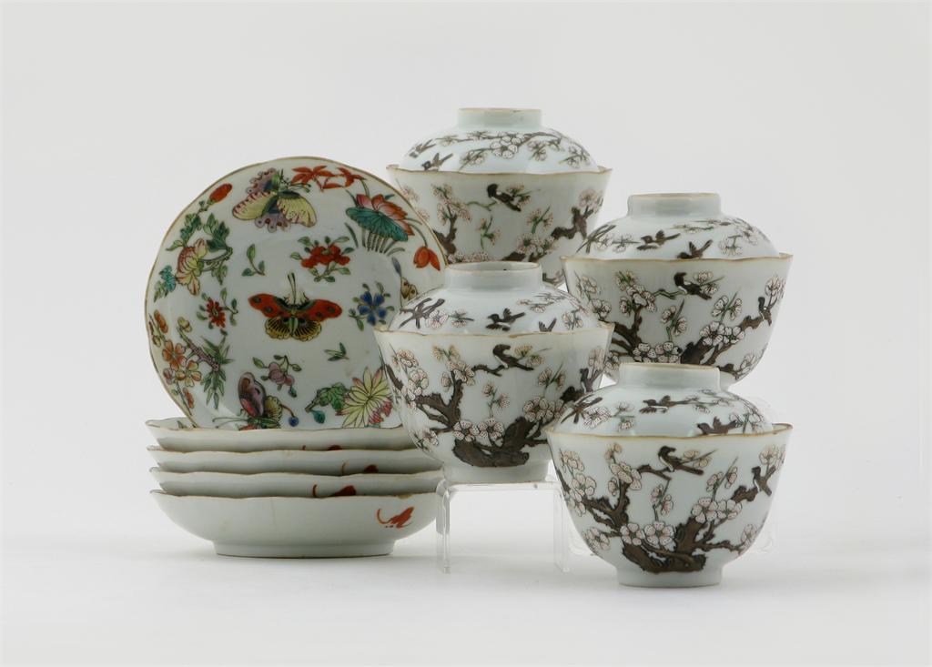 A set of four Chinese covered magpie bowls, 19th century. Each decorated with magpies and flowering prunus trees, each with an iron red peach mark, together with a set of five famille rose saucers, marked with endless knots, some damages, 13.4cm max. (13)
