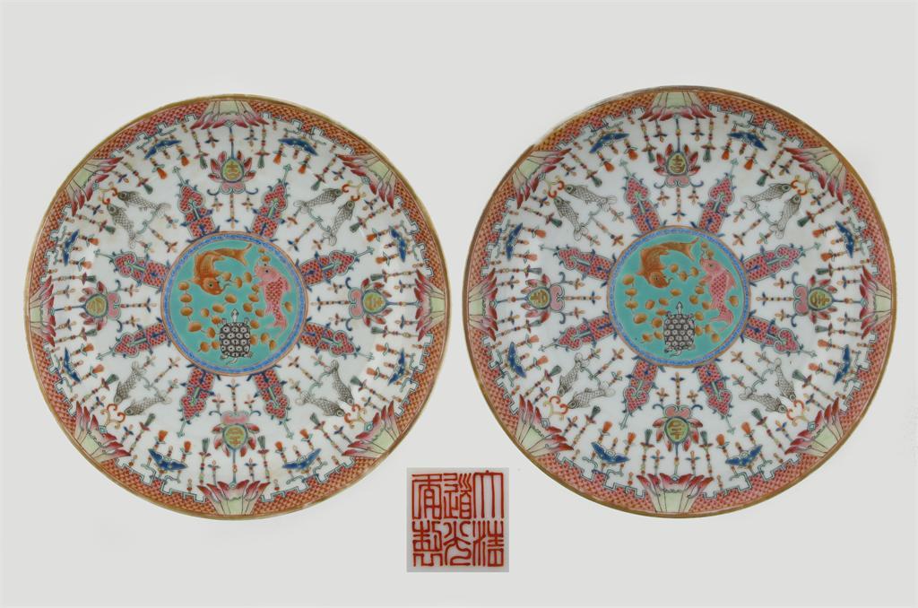 A pair of Chinese famille rose dishes, six character Daoguang marks and perhaps of the period. The centres decorated with panels of fish and swimming turtles encircled by twin fish and other auspicious symbols, 18.5cm. (2)