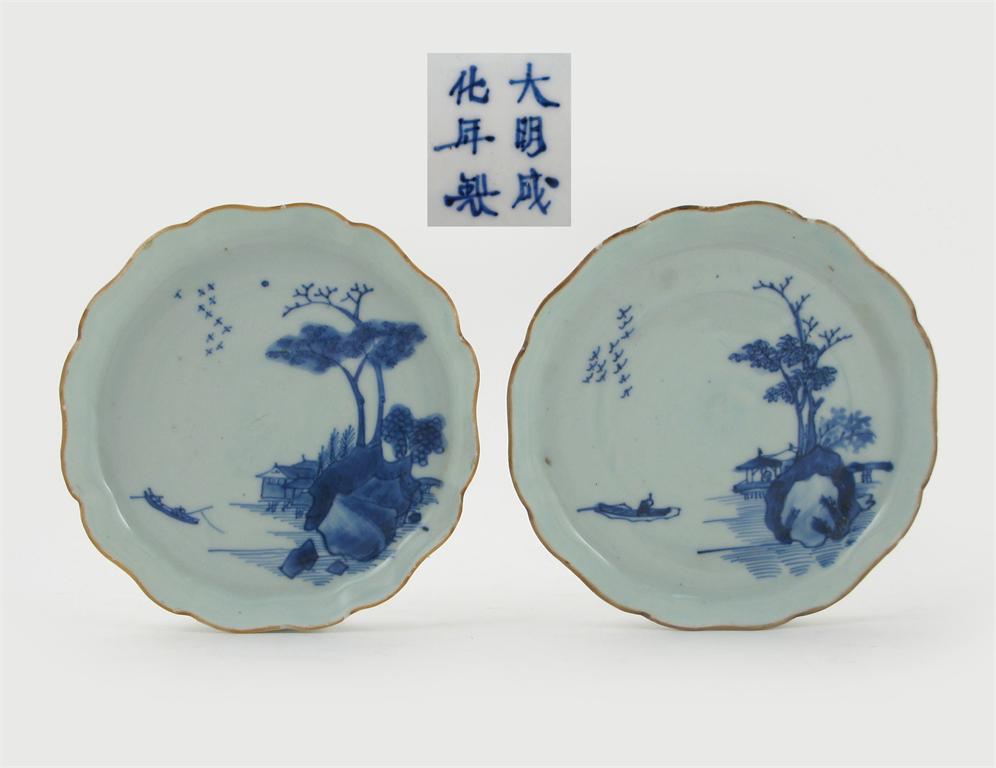 A pair of Chinese blue and white dishes, six character Chenghua marks, c.1650. With lobed rims and painted with boats approaching buildings in rocky river landscapes, 14.7cm. (2)