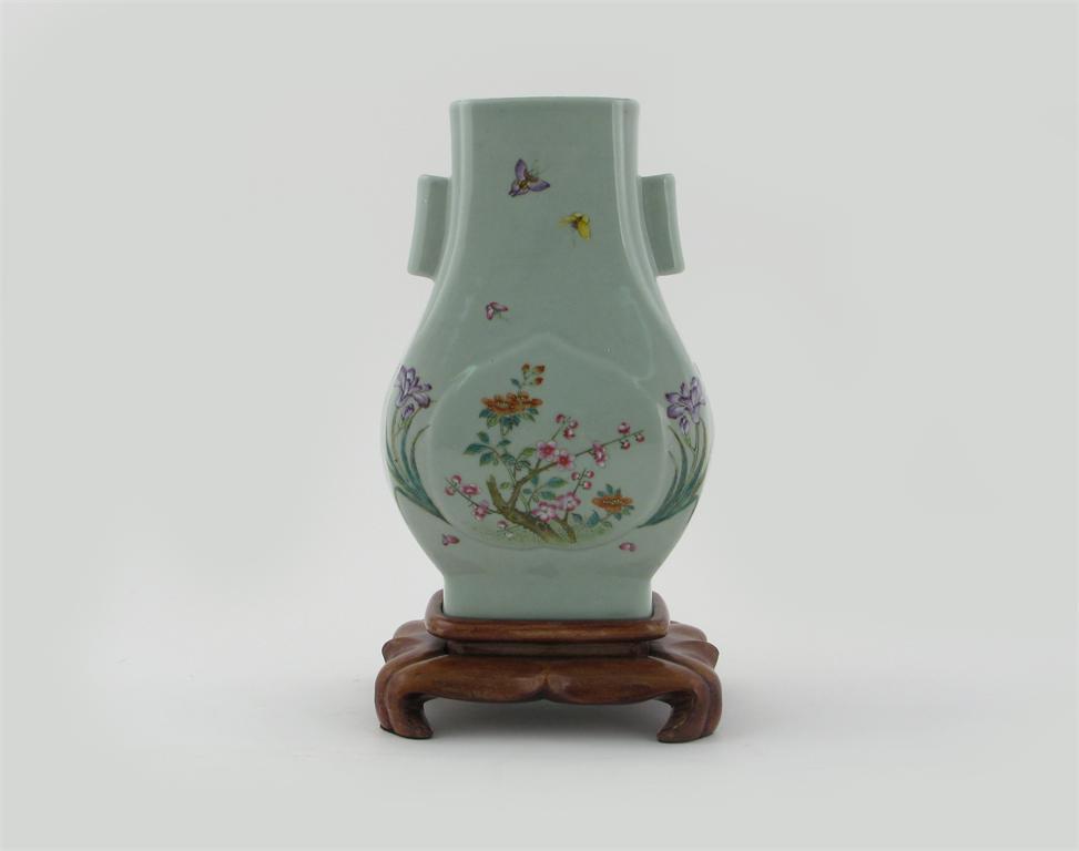 A Chinese celadon hu-shaped vase, six character Guangxu mark and of the period 1875-1908. Finely painted with flowers and insects in famille rose enamels, raised on a wood stand, the base drilled, 28cm. (2)