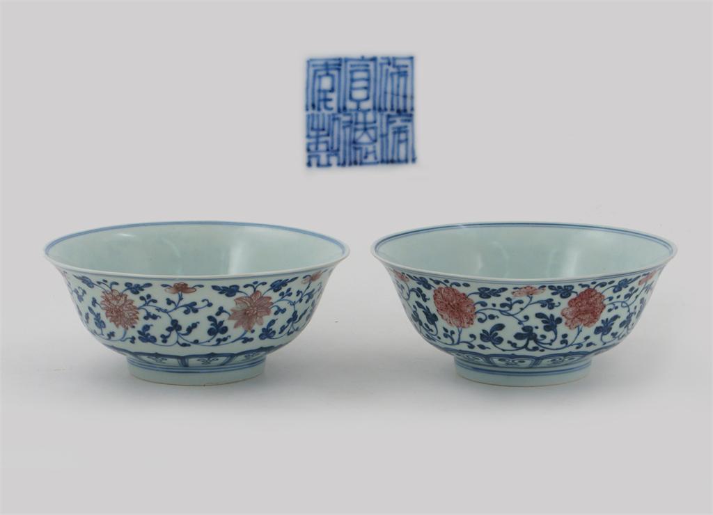 A pair of Chinese blue and white and copper red bowls, six character Xuande seal marks but 18th century. Each painted with flowerheads and scrolling foliage with bands of lappets around the feet, 21cm. (2)