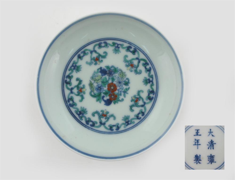 A small Chinese doucai dish, six character Yongzheng mark but probably later. Painted with flowers, 11cm.