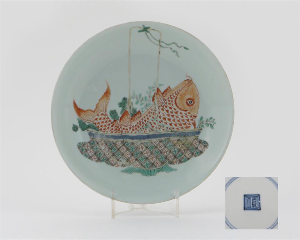 A Chinese famille verte dish, Kangxi 1662-1722. Painted with a large red carp lying in an elaborate basket, the reverse with a seal mark, a faint haircrack, 21cm.