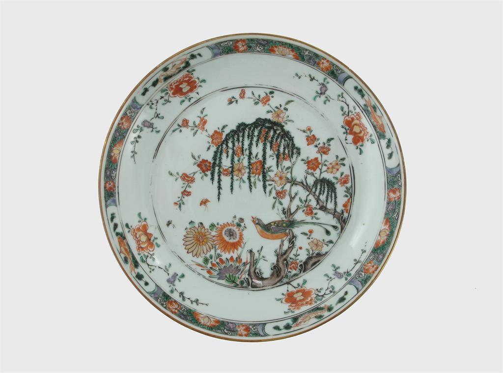 A Chinese famille verte saucer dish, Kangxi c.1700. Painted with a colourful bird perched below a willow tree amidst flowering shrubs, the border with four panels of fish and crustacea, a faint rim crack, 24.6cm.