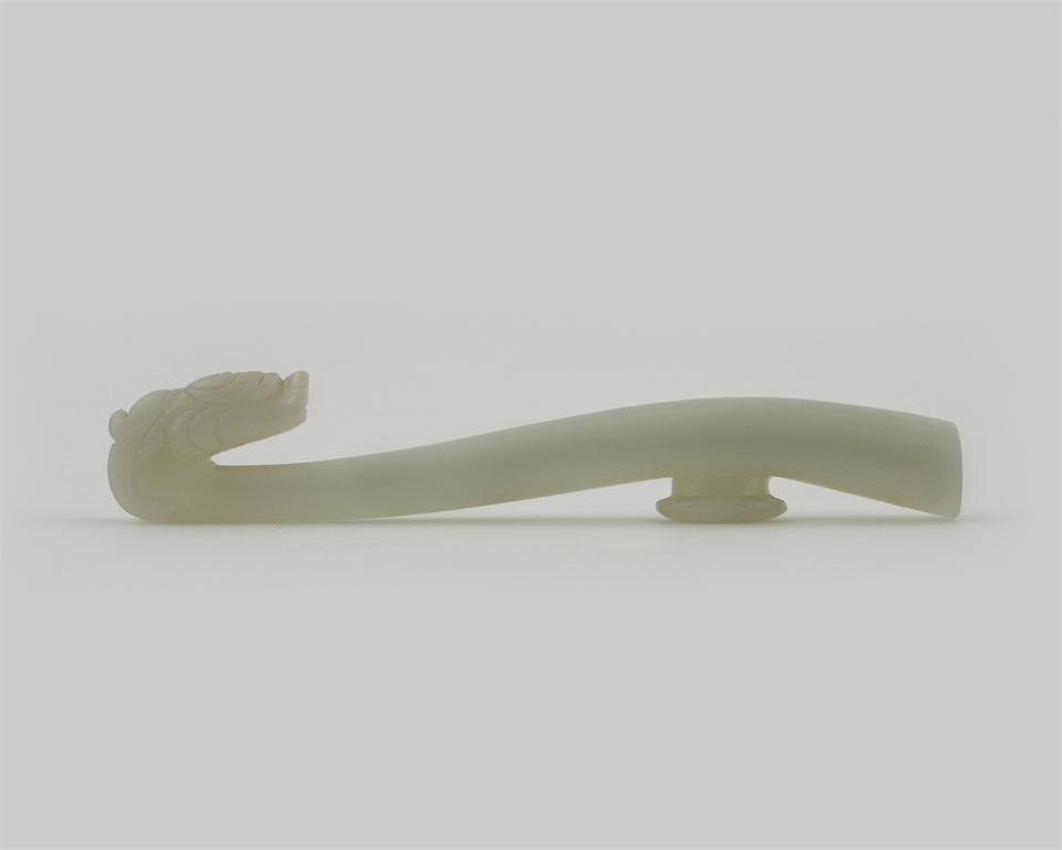 A Chinese white jade belt buckle, probably early 19th century. The terminal carved as a dragon's head, 11.8cm.