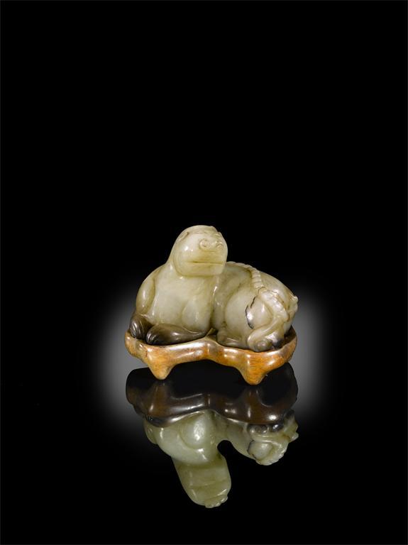 A Chinese celadon jade model of a lion-like beast, probably late Ming. Recumbent with its body elegantly curved around, with its head turned to the left, the well defined backbone terminating in a bifid tail, the stone with black and brown striations, 6.5cm. Raised on a hardwood stand. (2)