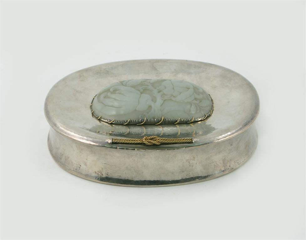 A continental silver coloured metal oval box, the hinged lid inset with a Chinese pale celadon jade plaque, carved with two finger citron growing on a leafy branch, the plaque 12cm, the box 22cm.
