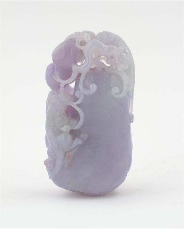 A Chinese lavender jadeite carving, of a large fruit, upon which two chilong dragons creep and with smaller fruit and a lingzhi fungus issuing from the stem, 7.2cm.