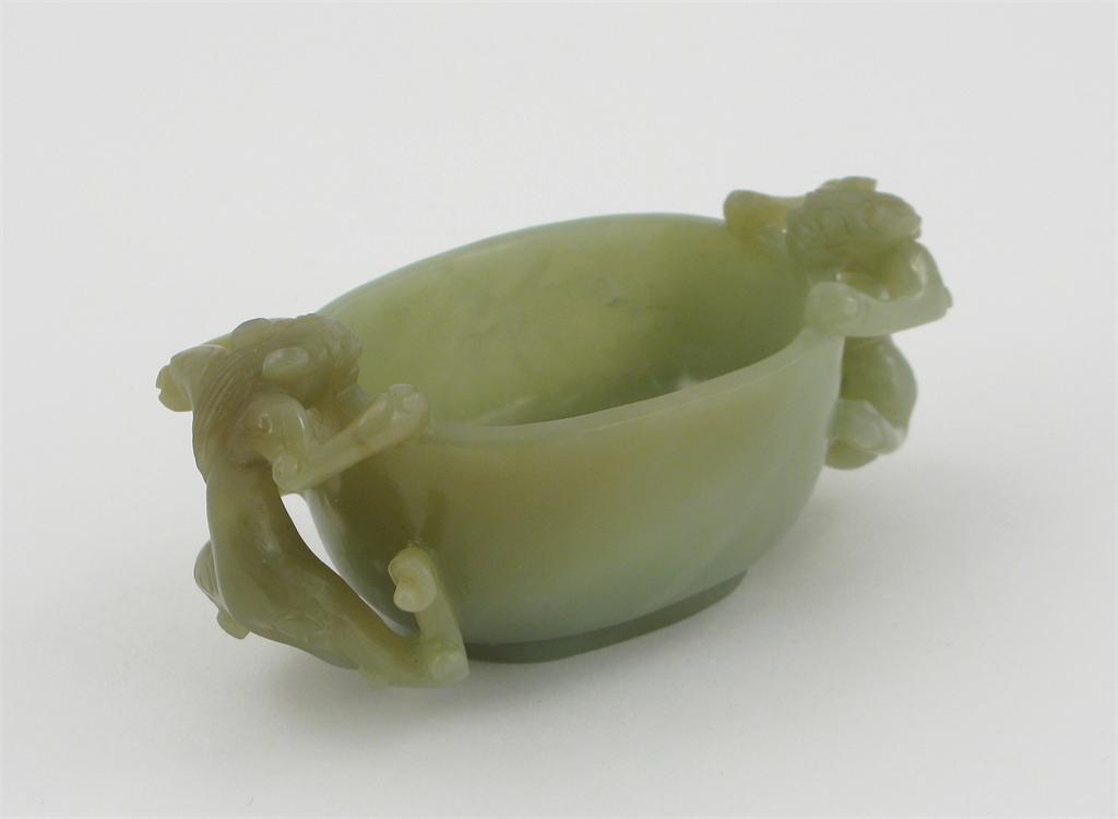 A Chinese yellow jade oval cup, 18th century. With two dragon handles, each with their heads looking over the rim, 9.5cm.