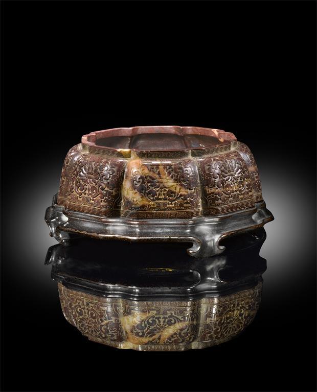 An extremely rare and fine Chinese Imperial soapstone brushwasher, rare gilded Qianlong mark and of the period 1736-92. The octofoil form engraved with stylized lotus between key fret borders, the stone a dark red brown colour with paler striations, raised on a carved hardwood stand, 15.6cm. (2)