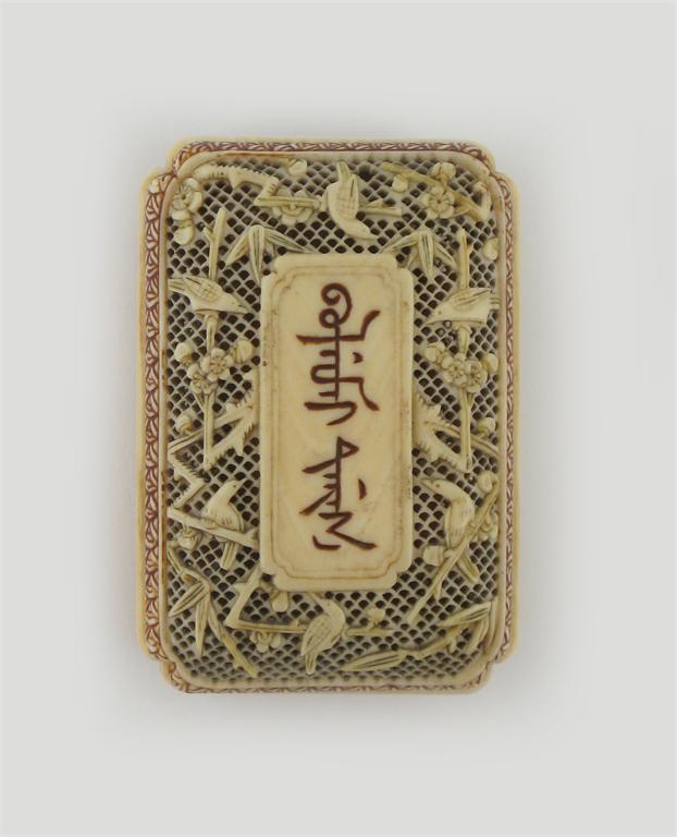 A rare Chinese ivory abstinence pendant, 18th century. Constructed as a reticulated rectangular box, finely carved with birds perched on prunus, on side with the characters zhai jie in Chinese, the other side with bolgomi karga in Manchu characters, 6cm. (2)