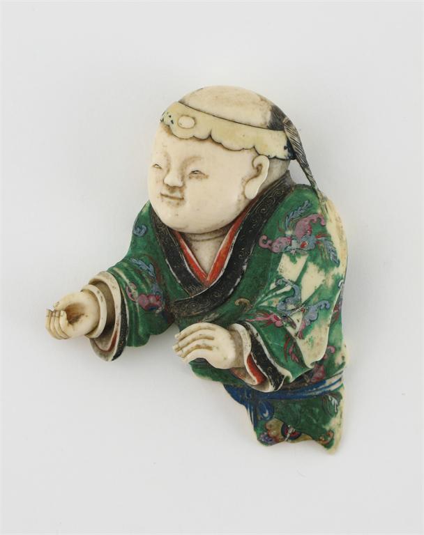 A small Chinese ivory appliqué, 18th/19th century. Depicting the top half of a small boy stretching out his hands, his robe cold-painted in green, pink, blue, red and black, the colours worn, 9.5cm.