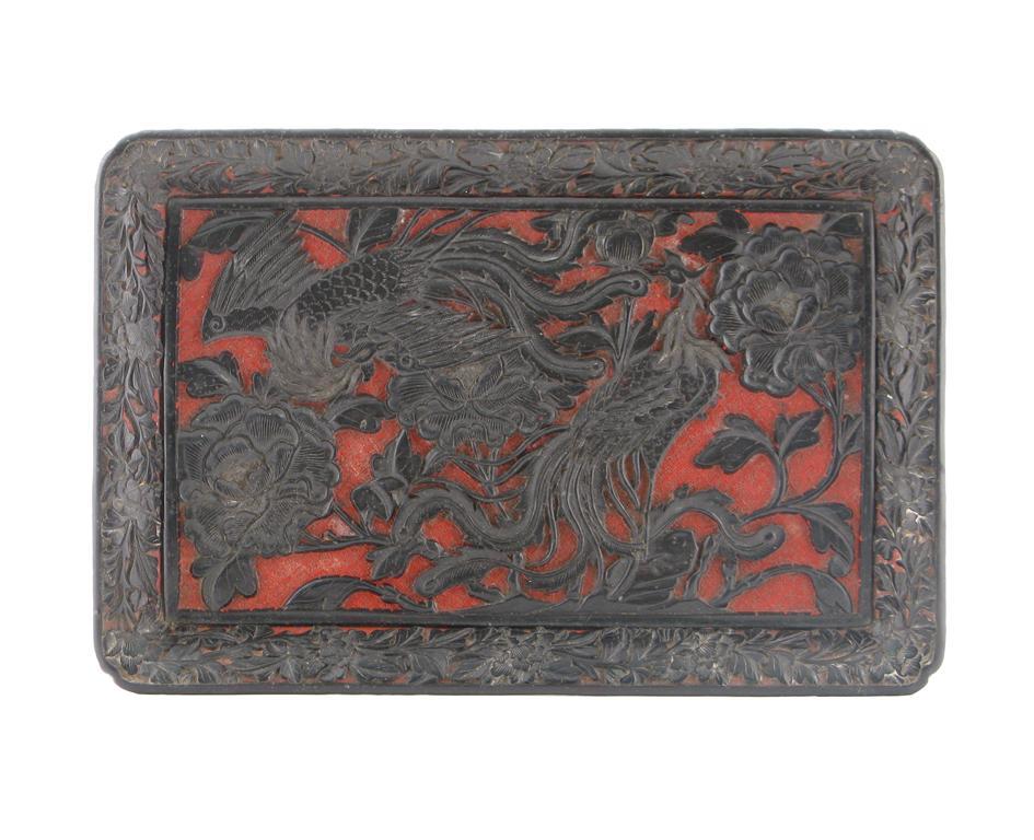 A Chinese black and red cinnabar lacquer rectangular tray, 19th century. Carved with phoenix amidst flowering peony, the border with further peony above a key fret band around the foot, 38cm.