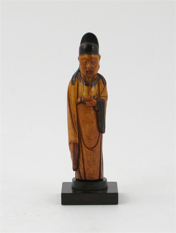 A good Chinese ivory carved figure, 17th century. Probably of Wen Chang, the God of literature, standing holding his belt and wearing long flowing robes, his hat and sleeves with dark stain, 15.3cm, and a modern wood stand.
