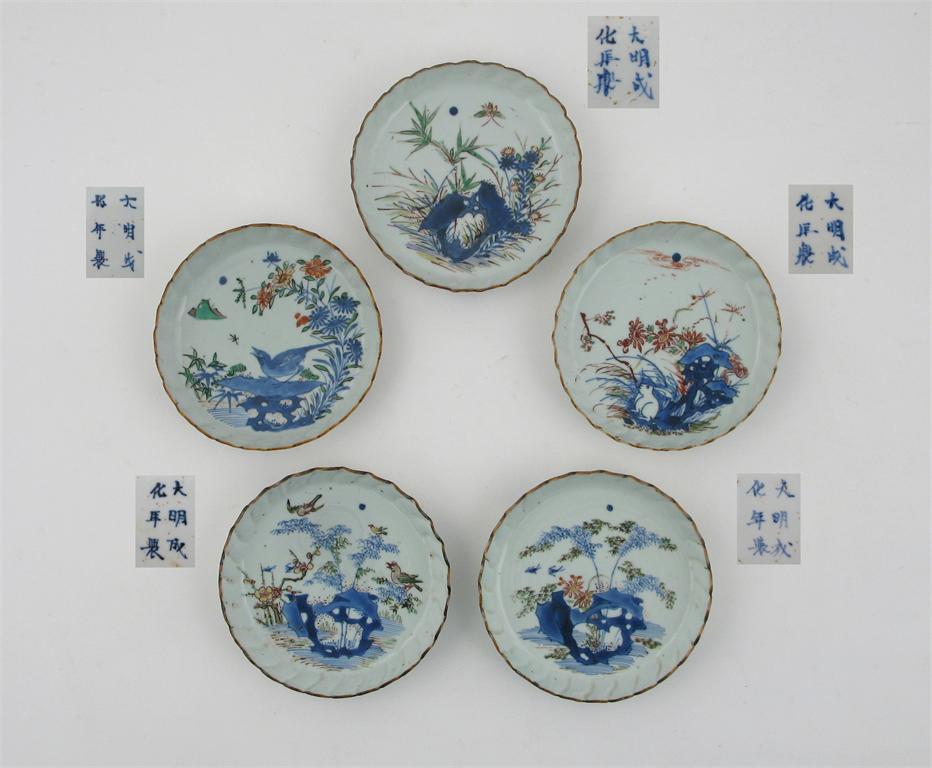 Five Chinese wucai moulded dishes, six character Chenghua marks but mid 17th century. Decorated with birds perched or in flight amidst flowers and rockwork, one with a crouching hare, and another with a large insect, 14.5cm. Contained in a modern wooden case. (5)