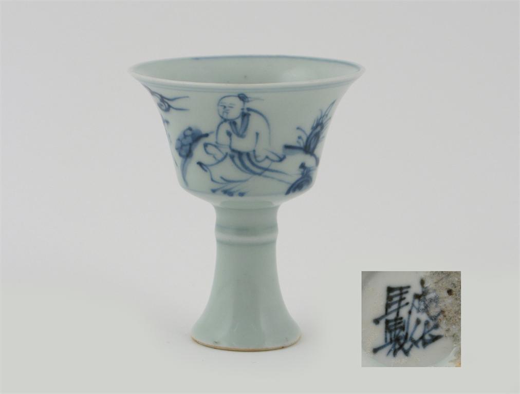 A small Chinese blue and white stem cup, four character Chenghua mark but 17th century. The interior painted with a flower spray, the exterior with two figures sitting in a grassy landscape, 7.5cm.