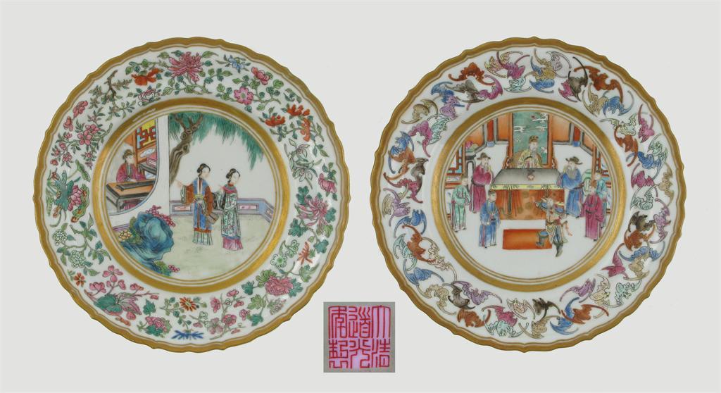 A set of three Chinese famille rose plates, six character Daoguang marks and of the period 1821-1850. The centres decorated with figures in interiors and in a garden, the borders with fruit, flowers and one with many bats, the backs green-glazed and with borders painted with butterflies amidst flowers, one plate extensively damage, 19.6cm. (3)