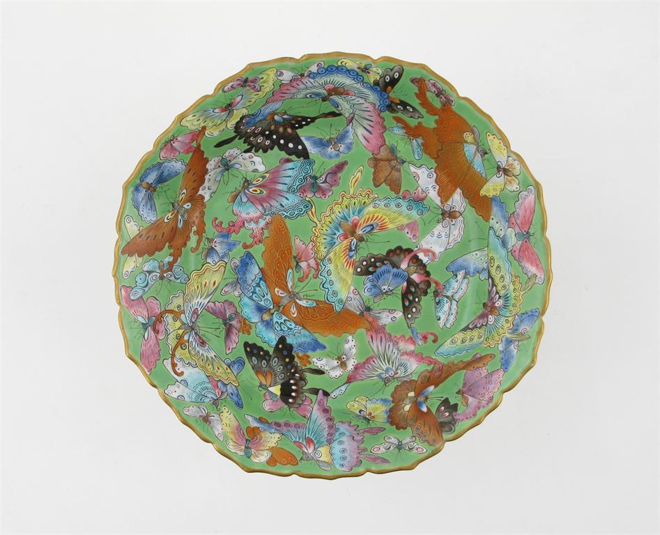 A good Chinese butterfly dish, Jiaqing six character mark and of the period 1796-1820. Brightly painted in famille rose enamels and gilt with an abundance of colourful butterflies on a green ground, the reverse with many fruiting leaf sprays, 20.7cm.