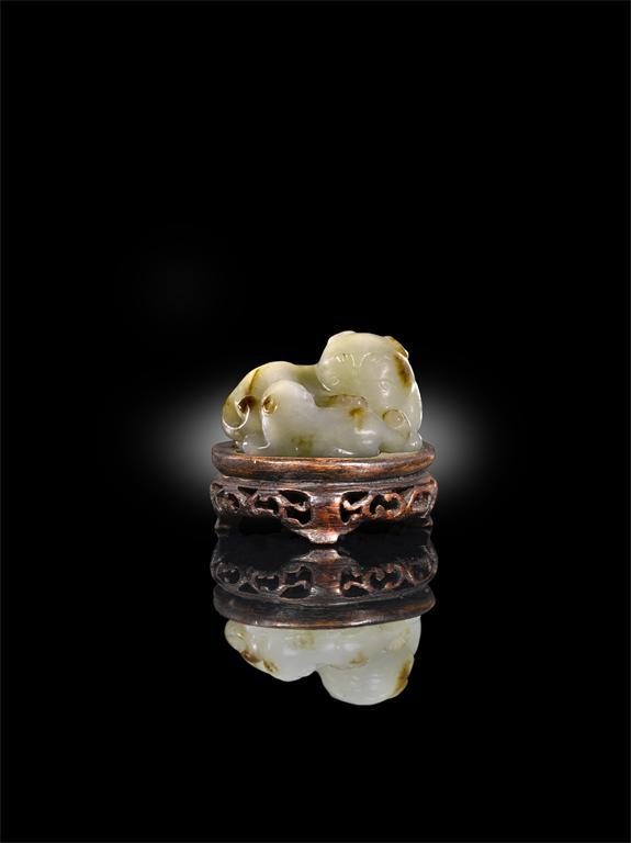 A small Chinese pale celadon jade carving of a cat and her kitten, 18th/19th century. The stone flecked with dark markings, together with a wood stand, 4.5cm. (2)