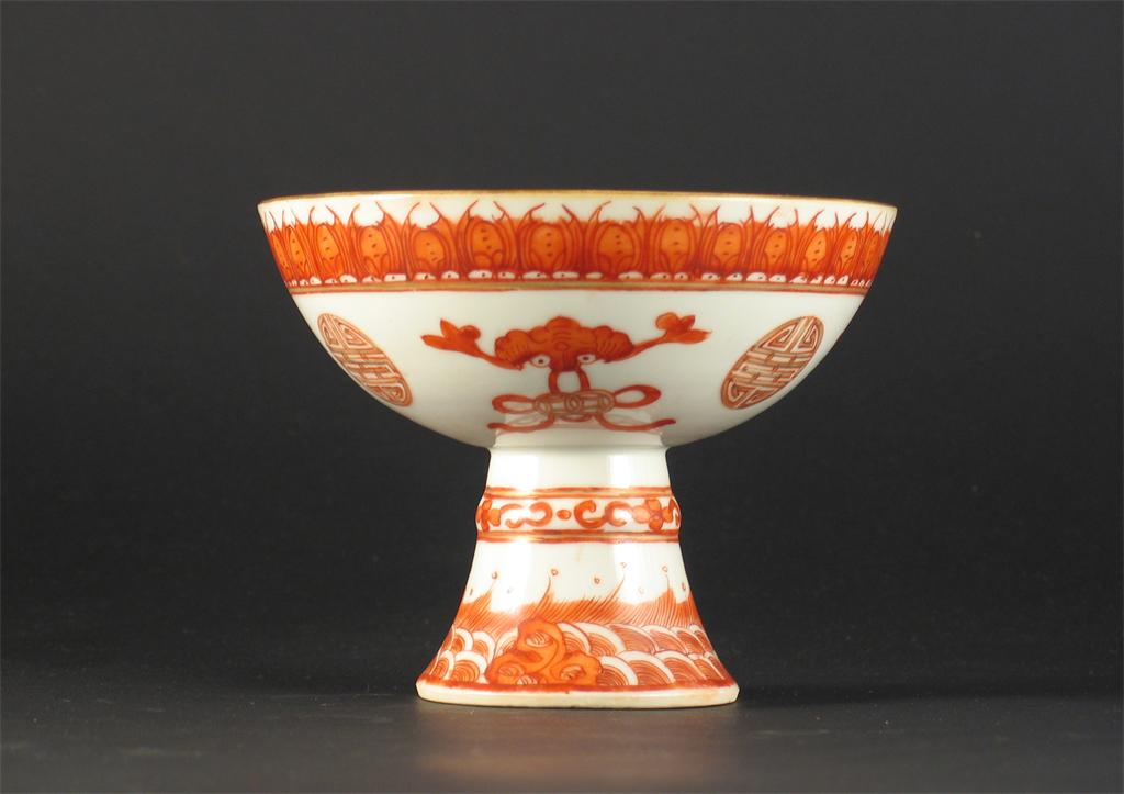 A Chinese stem bowl, painted in iron red and gold with shou characters, stylized borders and wave motifs, unmarked, 19th century, 13.2cm.