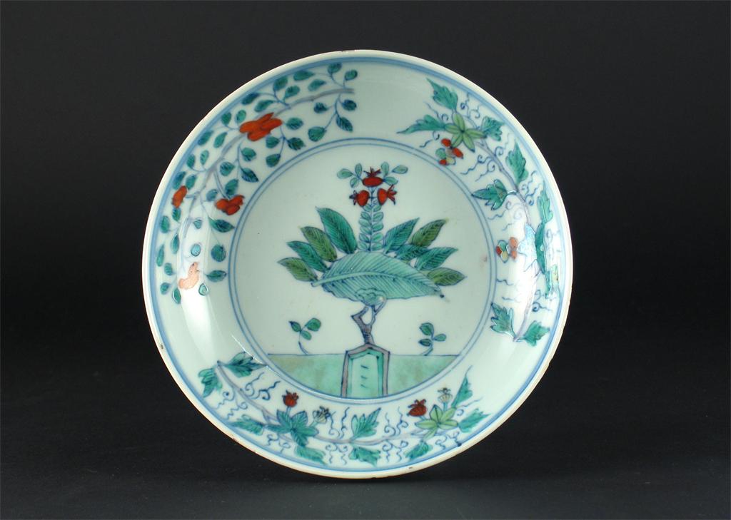 A Chinese doucai saucer dish, painted with a central artemesia leaf issuing further leaves and fruit, the border with three flowering branches, the reverse with three further branches and a six character Chenghua mark. A few small rim frits. Kangxi 1662-1722, 16cm.