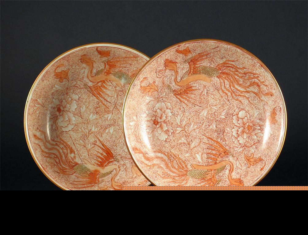 A pair of Chinese dishes, each painted in iron red and gilt with phoenix amidst peony, the backs with five bats, six character Qianlong marks and probably late in the period, 19.5cm. (2)