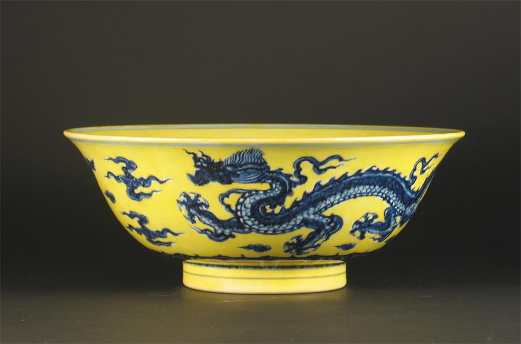 A Chinese bowl, decorated in blue with two five-clawed dragons on a yellow ground, repeated on a medallion to the interior, six character mark for Xuande but 20th century, 26cm. Across.
