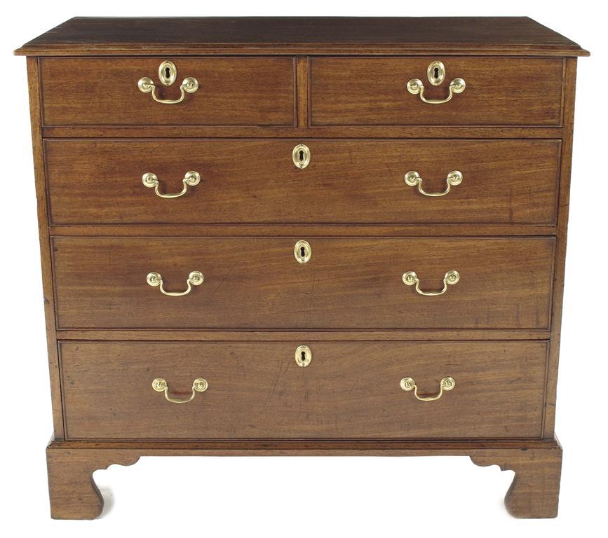 A George III mahogany chest, with replaced brass handles and locks, on bracket feet, 40.25in (102cm) h, 43.5in (110.5cm) w, 21in (53cm) d.