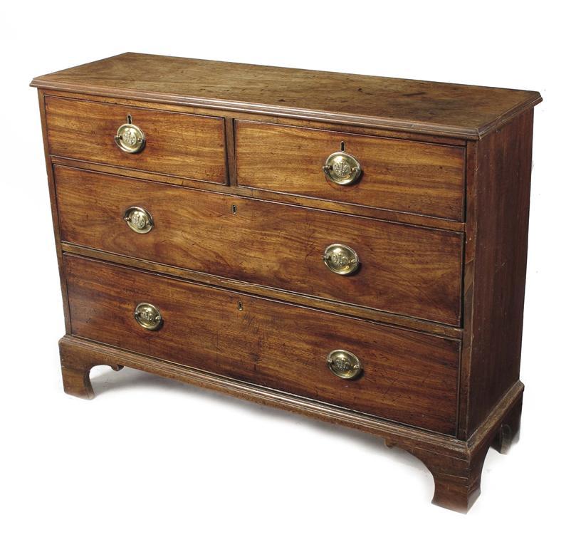 A mahogany narrow chest, with two short and two long drawers, with brass oval Prince of Wales plume handles, with an enamel label to the back 'G. JETLEY, 52 SOUTH AUDLEY ST, LONDON, W.',19th century and reduced, 32in (81cm) h, 43.25in (110cm) w, 13.75in (35cm) d.