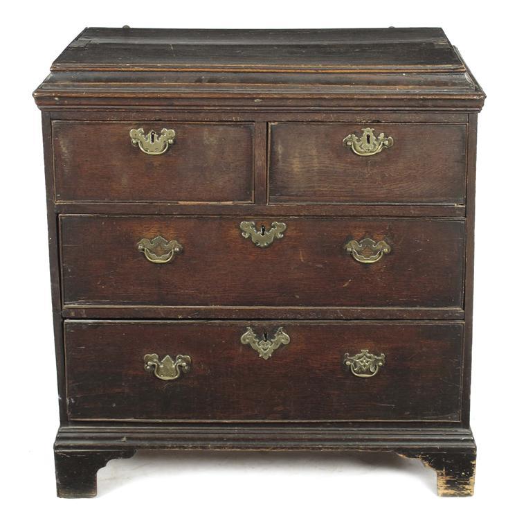 An oak chest, having a raised moulded edge top previously with a superstructure, above two short and two long drawers with replaced handles, 18th century and later, 33.5in (85cm) h, 32.25in (82cm) w, 19.5in (50cm) d.